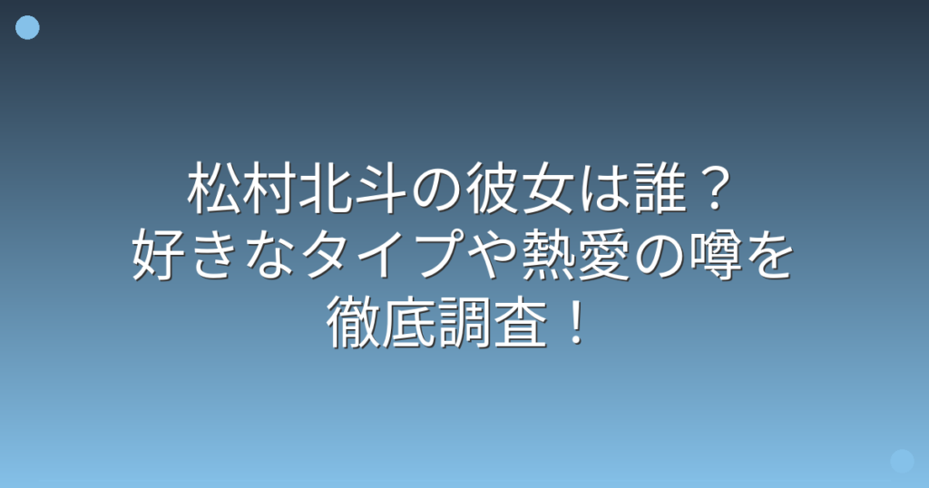 SixTONESのメンバーとして活躍中の松村北斗さんの彼女について、ファンの間で話題になっていますね。 ドラマや映画で大活躍し、その端正なルックスと演技力で多くのファンを魅了している松村北斗さんですが、プライベートな恋愛事情も気になるところです。... -
