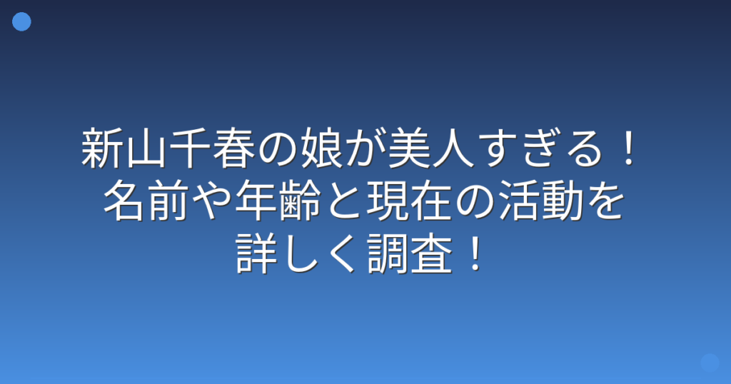 タレントの新山千春さんの娘さんが話題になっていますね。 新山千春さんは元グラビアアイドルとして活躍し、現在もバラエティ番組などで活躍されていますが、娘さんについても注目が集まっています。 そこで今回は、新山千春さんの娘さんの名前や年齢、そ... -