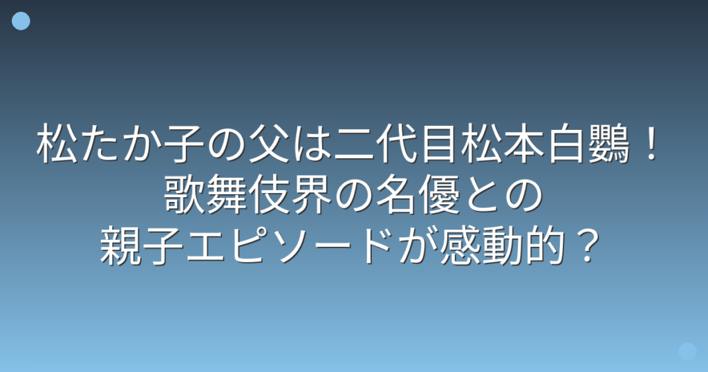 女優として数々の名作に出演し、歌手としても活躍する松たか子さんですが、その父親について注目が集まっています。 実は松たか子さんの父親は、歌舞伎界を代表する名優なんです。 そこで今回は、松たか子さんの父親の職業や親子関係、感動的なエピソード... -