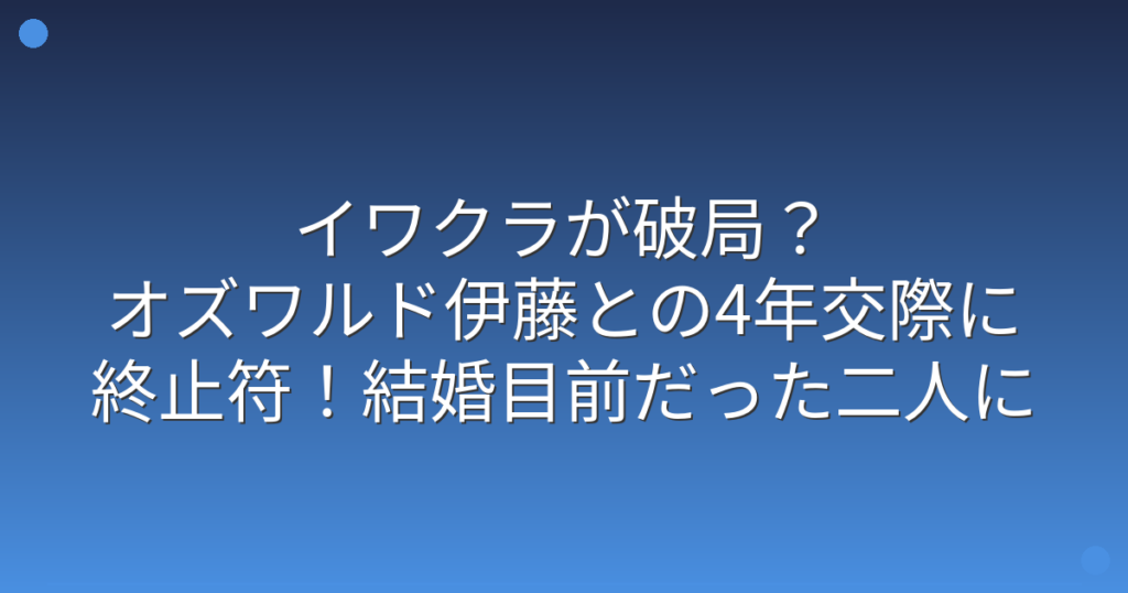お笑いコンビ・蛙亭のイワクラさんと、オズワルドの伊藤俊介さんが破局していたことが明らかになり、大きな話題となっていますね。 約4年間の交際を経て、結婚も間近と見られていた二人の突然の破局に、ファンや業界関係者も驚きを隠せない様子です。 そこ... -