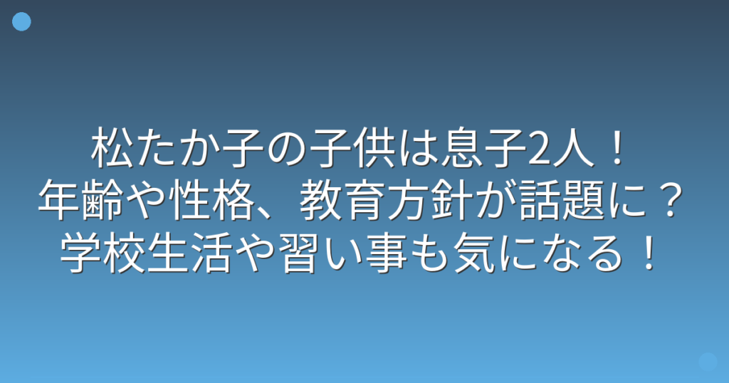 女優として活躍する松たか子さんの私生活が注目を集めています。 特に松たか子さんの子育てについて、ファンの間で大きな関心が寄せられているようです。 そこで今回は、松たか子さんの子供たちについて、年齢や性格、教育方針など、詳しく見ていきましょ... -