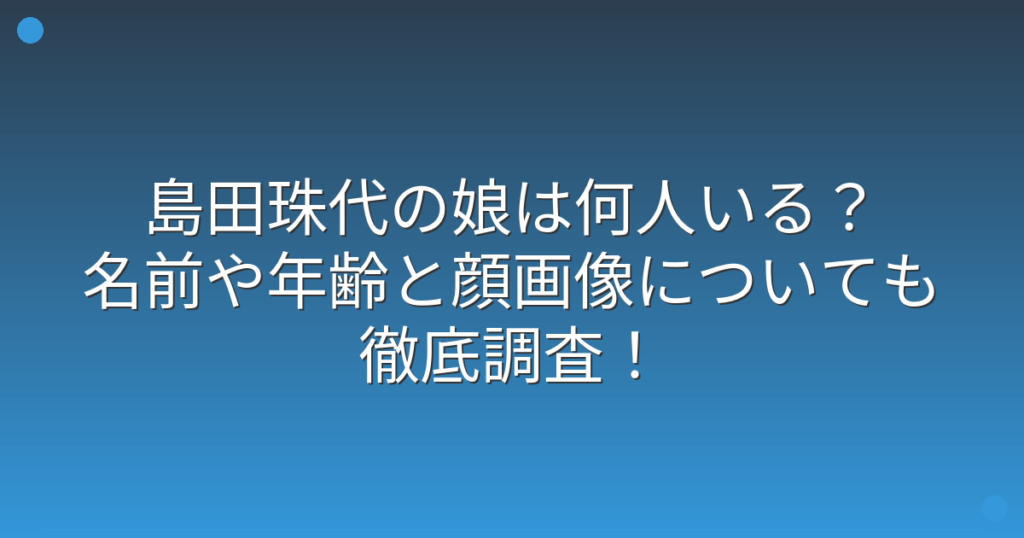 お笑いコンビ「吉本新喜劇」で活躍する島田珠代さんの娘について、ファンの間で話題になっていますね。 関西を中心に長年愛されてきた島田珠代さんですが、プライベートでは母親としての顔も持っています。 そこで今回は、島田珠代さんの娘さんの人数や名...