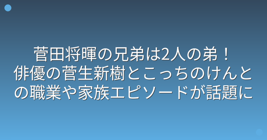 俳優として活躍する菅田将暉さんには、同じく芸能界で活動する2人の弟がいることが話題になっていますね。 特に弟のこっちのけんとさんが紅白歌合戦への出場報道や精神疾患を公表したことで、改めて菅田将暉さんの家族構成や兄弟関係に注目が集まっていま... -